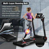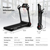 Our electric running machine is designed with a 43.5'' x 16.5'' 5-layer running belt that is characterized by ex cellent shock absorption, skid resistance, and wear resistance, so it can effectively protect your joints and muscles. And the powerful 2.25 HP motor allow you to walk or run without disturbing others, making it ideal for home and office use. Besides, the treadmill is designed with a 0.6-8MPH speed range helping you meet your variety of fitness goals. More importantly, our treadmill can connect to your mobile device via Bluetooth and be controlled by the APP, helping record fitness data and provide various fitness courses. And thanks to the Bluetooth speakers, you can enjoy entertainment while running. In addition, there is a LED display screen to show your current running data. What' s more, our machine can be folded which won' t take up too much space and has transport wheels for easy movement.